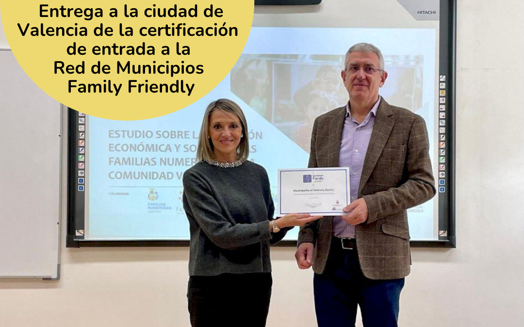 Eduardo Hervás, presidente de la Federación de Familias Numerosas de la Comunidad Valenciana, FANUCOVA entrega a la concejal de Familia, juventud e infancia del Ayuntamiento de Valencia, Mónica Gil, del certificado que reconoce la inclusión de Valencia en la Red de Municipios Europeos Family-Friendly. El acto de entrega ha tenido lugar durante la presentación del III Estudio sobre la situación económica y social de las familias numerosas de la Comunidad Valenciana, un estudio realizado por FANUCOVA a cerca de 1200 familias.