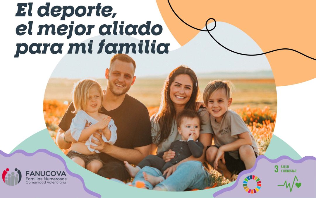 FANUCOVA, la Federación de Familias Numerosas de la Comunidad Valencia, continúa apostando y dando visibilidad a los Objetivos de Desarrollo Sostenible de la Agenda 2030, por ello en el mes de abril volveremos a trabajar el ODS 3 ‘Salud y Bienestar’, y como sabemos que se acerca el Día Internacional de la Familia, el próximo 15 de mayo, hemos organizado para todas nuestras familias asociadas la primera edición del ‘Día del Deporte en Familia’, bajo el lema ‘El deporte el mejor aliado para mi familia’.