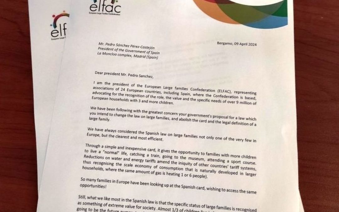 La Confederación Europea de Familias Numerosas (European Largen Family Confederation – ELFAC), a la que pertenecen asociaciones de 24 países europeos, entre ellos, España, ha enviado una carta al presidente del Gobierno, Pedro Sánchez, para mostrar su preocupación ante la Ley de Familias y lo que plantea para las familias numerosas españolas, y pedirle que mantenga el concepto y regulación que tienen estas familias a través de una ley específica que es un referente en Europa.