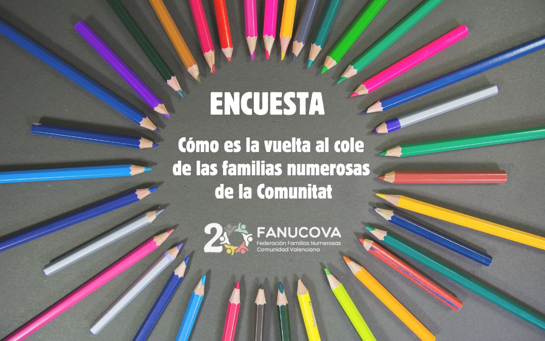 La vuelta al cole es para las familias numerosas unos de los gastos anuales más difíciles de afrontar y de los cuales no hay escapatoria, por eso FANUCOVA con la colaboración de nuestras cinco asociaciones (ASAFAN, FANUCAS, ASFANA, AVAFAM y MAS DE DOS) hemos lanzado una breve encuesta para conocer la situación, las demandas y los obstáculos que este nuevo inicio de curso nos plantea.
