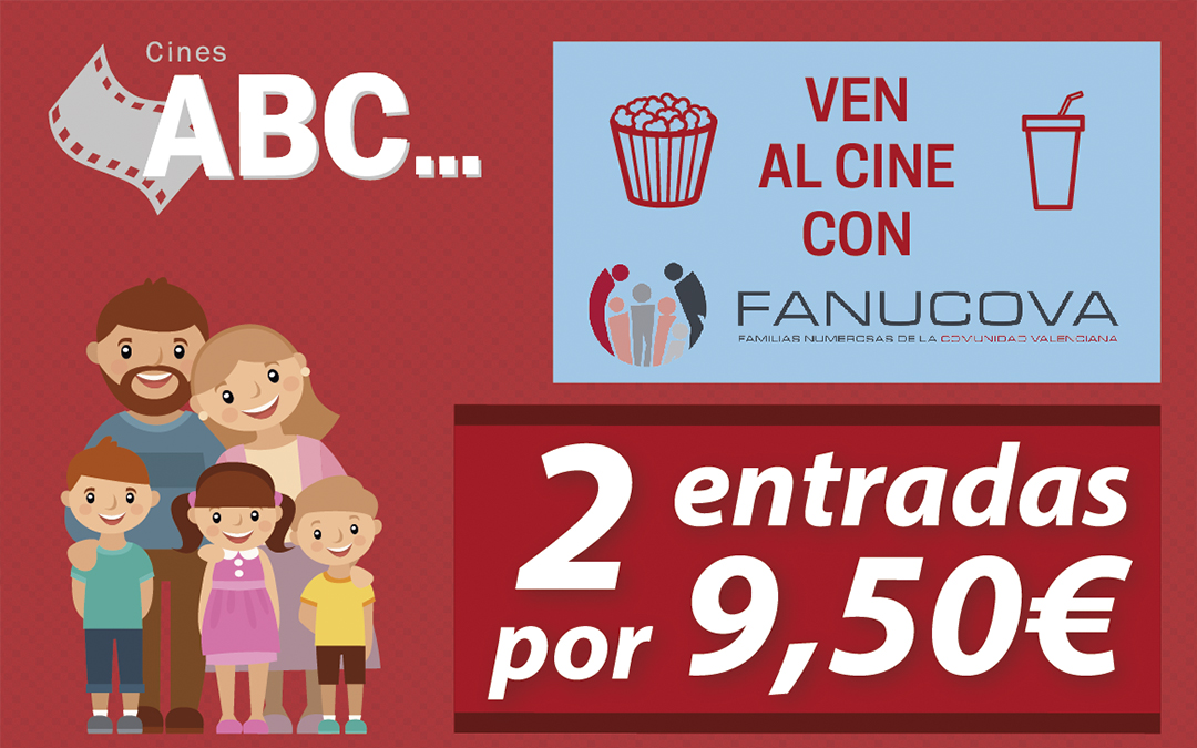 En FANUCOVA sabemos que ir al cine es un auténtico lujo y esfuerzo para muchas familias numerosa por eso a través de nuestro programa Culturarte queremos ofreceros la posibilidad de ir al cine con vuestras familias por la mitad de precio. Pásate por cualquiera de nuestras asociaciones (ASAFAN, ASFANA, AVAFAM, MAS DE DOS Y FANUCAS) y recoge tus tarjetas promocionales 2×1 para familias numerosas de Cines ABC. Esta remesa viene con una gran novedad porque también entran en la promoción películas de la Warner!