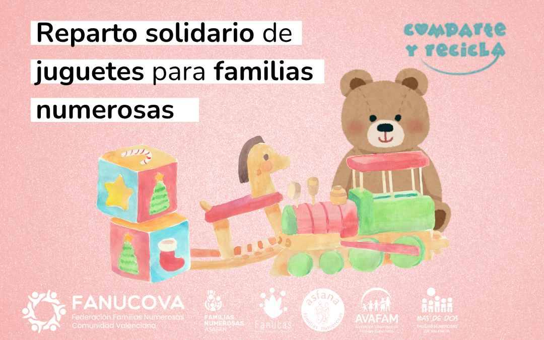 Gracias a este acuerdo, nuestras asociaciones —ASAFAN, FANUCAS, AVAFAM, ASFANA y MAS DE DOS— podrán distribuir juguetes en perfecto estado a las familias numerosas con menos recursos de la Comunidad Valenciana, tanto a las que ya son socias como a aquellas que deseen asociarse.
