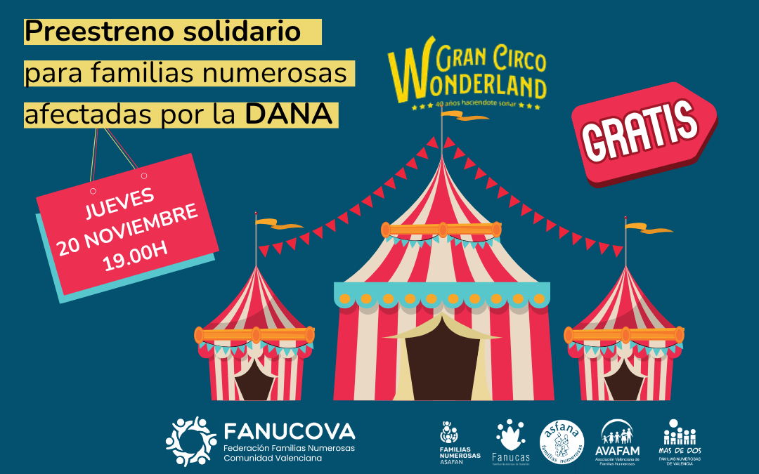 Gracias a la colaboración entre el Circo Wonderland y FANUCOVA, las familias numerosas asociadas que se hayan visto afectadas por la DANA podrán disfrutar de entradas gratuitas para el preestreno del nuevo espectáculo del circo.