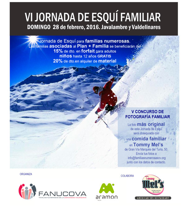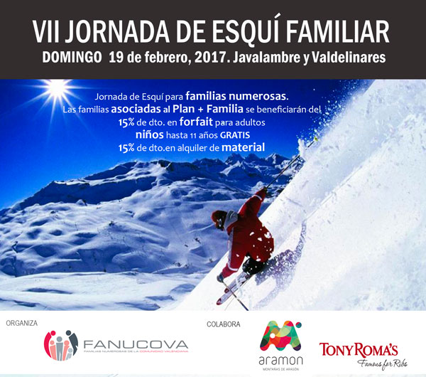 El próximo domingo 19 de febrero tendrá lugar la VII Jornada de Esquí Familiar en Javalambre y Valdelinares. Esperamos que  el tiempo nos acompañe y podamos disfrutar de un divertido día en la nieve. Las familias asociadas podrán disfrutar de un 15% de dto. en el forfait para adultos y gratis para niños de hasta 11 años, y un 15% de dto. en el alquiler de material.
