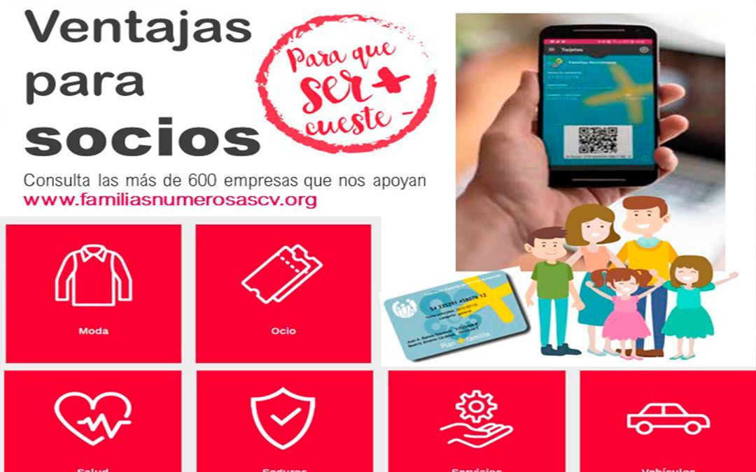 La Federación Española de Familias Numerosas dispone de un carné de socio unificado con una imagen común a todas las asociaciones, que sirve de documento acreditativo de pertenencia de las familias a una asociación. Este carné te da acceso a las ventajas que les corresponden a los asociados, descuentos en productos y servicios de múltiples empresas de la Comunidad Valenciana, además de acceder a los descuentos en otras comunidades autónomas al contar con un carné unificado en todo el Estado.